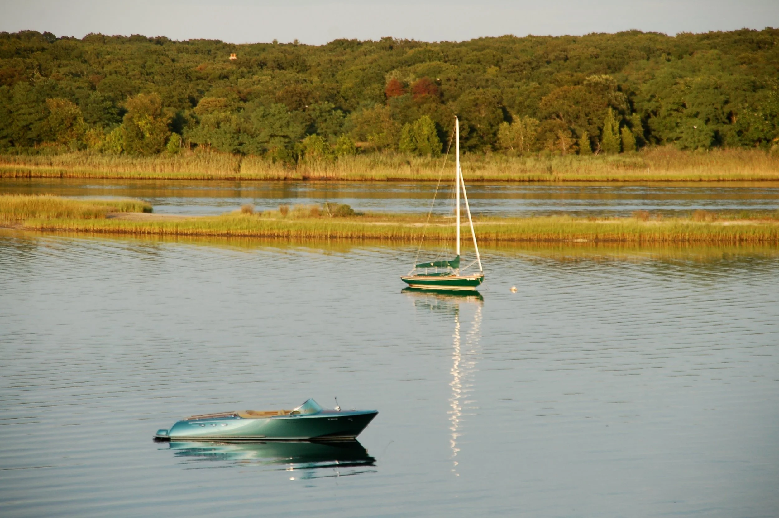 Classic motor and sailboats moored in Hampton Waters in front of our island
